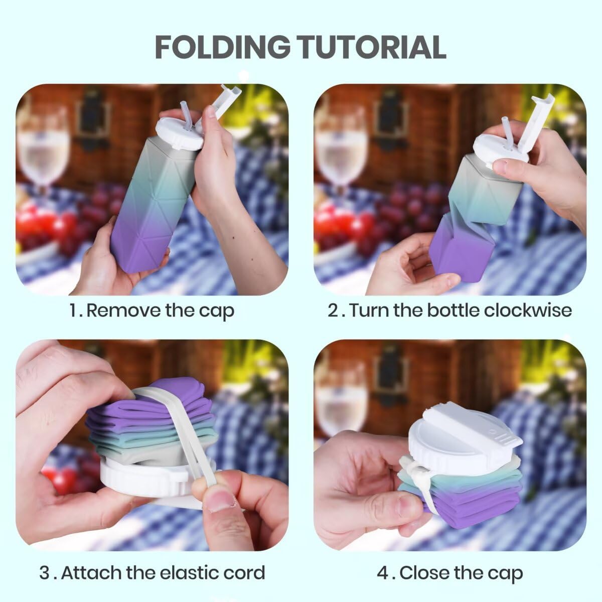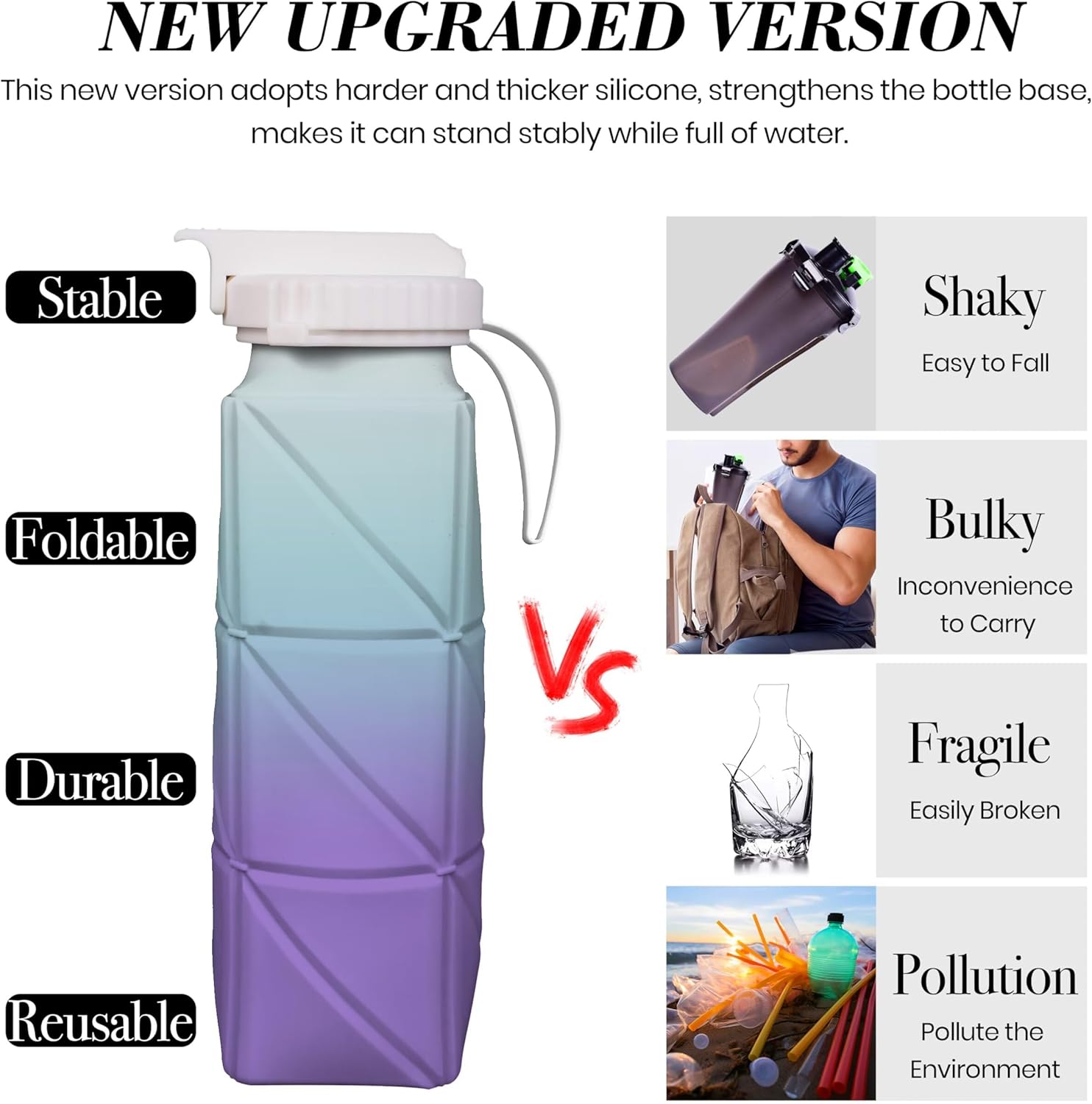 Collapsible Water Bottles with Straw Strap, BPA-Free Leak-Proof Silicone Collapsible Water Bottle Cup 620ml for Travel, Camping, Hiking, Cycling and Outdoor Sports (Blue-Purple Gradient)